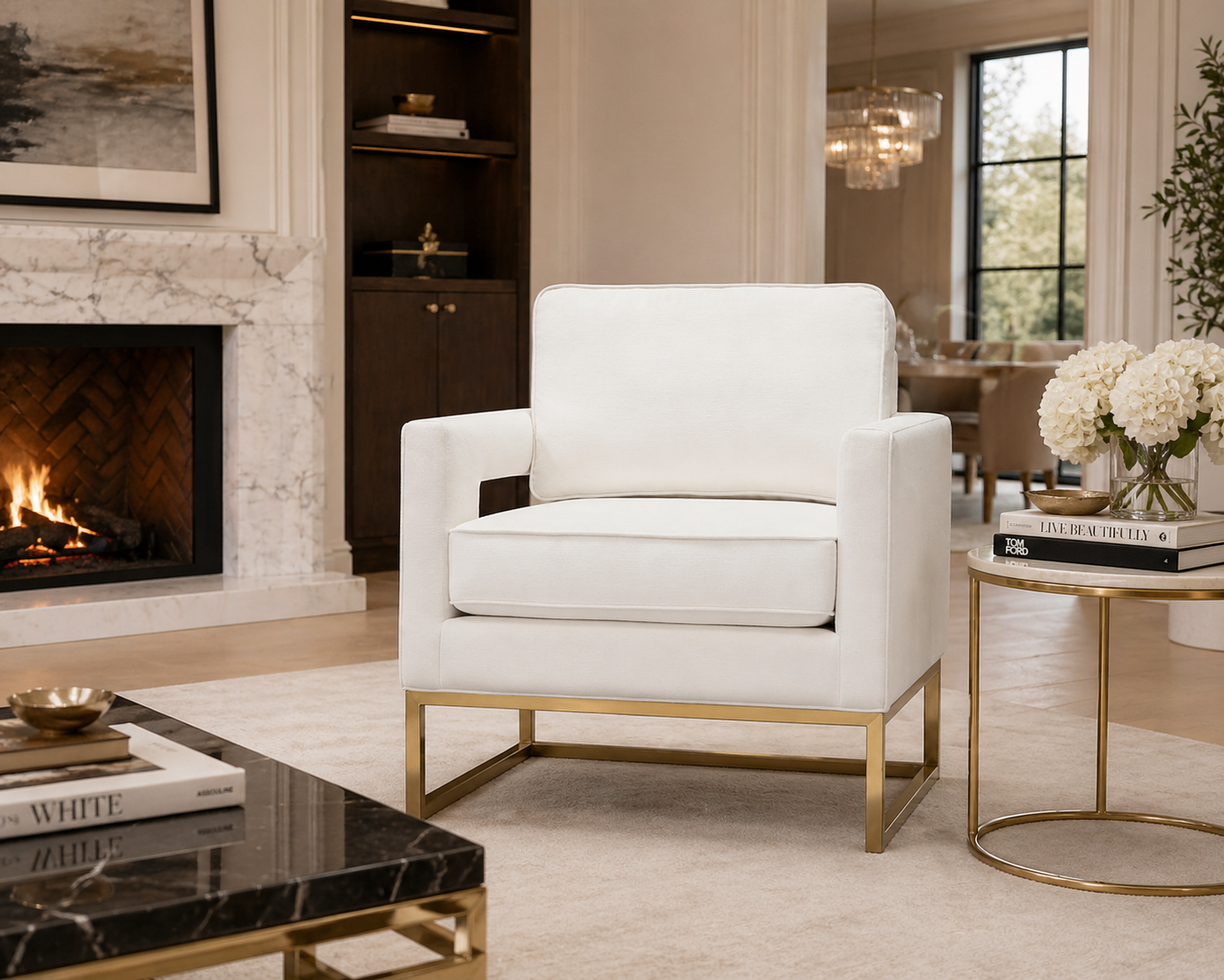Make an unforgettable statement in your home with this stunning ivory accent chair, where refined design meets everyday comfort. Upholstered in a soft, neutral fabric, this chair instantly brightens any space while effortlessly blending with both modern and classic interiors. The clean, structured silhouette is complemented by a sleek gold-finished base, adding just the right touch of luxury and sophistication.